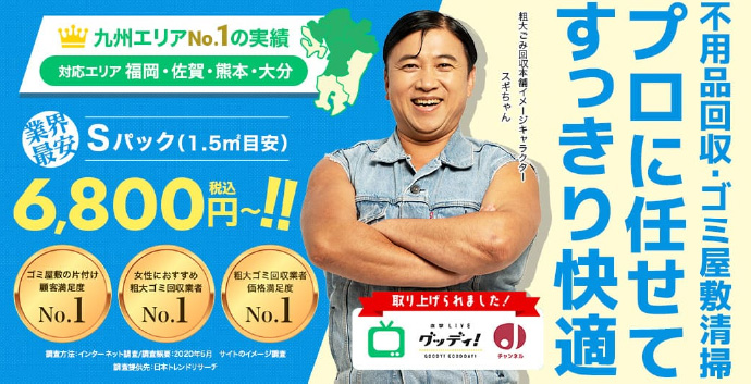 『粗大ゴミ回収本舗』は、質の高いスタッフを派遣して作業を行ってくれるので、福岡県で評価の高いゴミ屋敷清掃業者です。