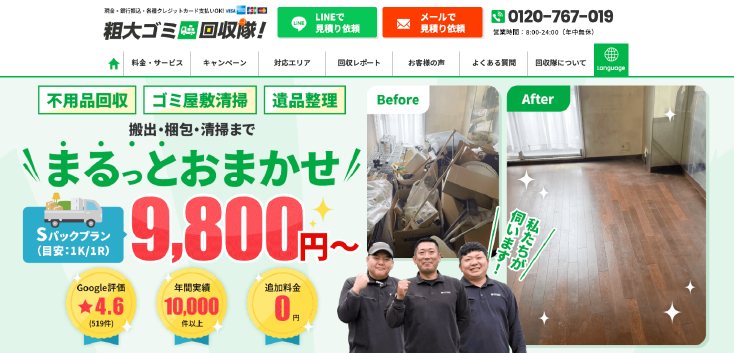 料金に関しては、軽トラックプラン(2,5㎥、20,000円)の廃品回収プラン等が用意されていますが、廃品量を伝えることで最もお得なプランを提示してくれます。また、当日廃品を追加したとしても、1㎥あたり8,000円で対応してくれるので料金的にも安心です。