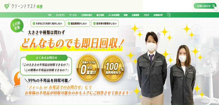 関西エリアで不用品回収や片付けサービスを検討している方に当メディアとしても自信を持っておすすめしたいのが「関西クリーントラスト」です。大阪を拠点に、関西各地へ幅広く対応しており、地域密着ならではのスピーディーな対応力が魅力!