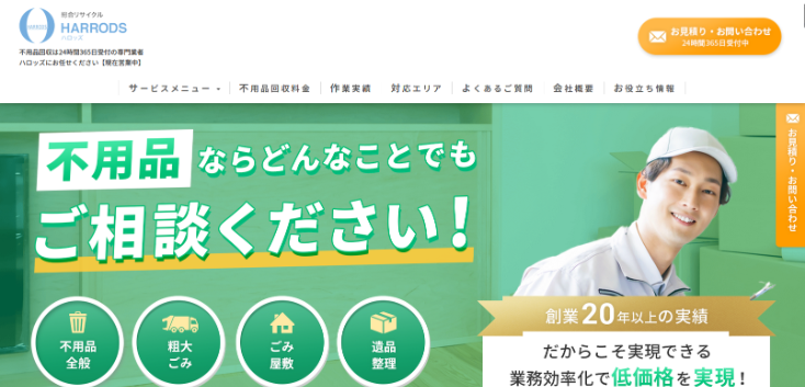 不用品回収業者をお探しの方におすすめなのが「総合リサイクルハロッズ」です。創業から20年以上の歴史を持つ同社は、急な依頼にも迅速に駆けつけてくれる点が大きな魅力。経験豊富な専門スタッフが訪問し、スピーディかつ丁寧に回収を行ってくれます。